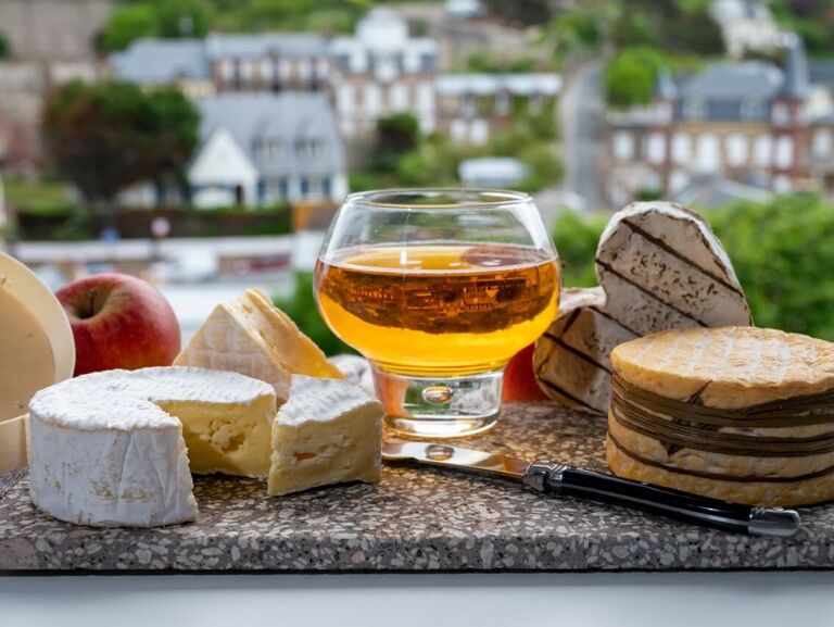Ausflug ins grüne Pays d'Auge – Käserei mit Kostprobe – Cambremer und der Garten Jardins du Pays d'Auge – Calvados-Brennerei mit Kostprobe – Abendessen in einem Restaurant in Trouville (ca. 120 km)