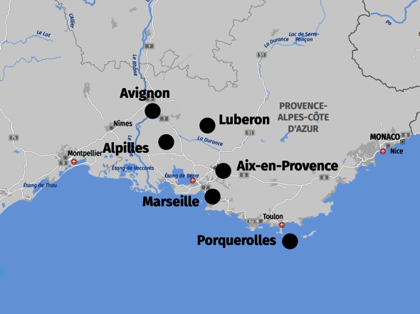- 8x Übernachtung/Frühstücksbuffet in einem 3- oder 4-Sterne Hotel (1x im Raum Valence, 6x in Aix-en-Provence, 1x in Beaune).